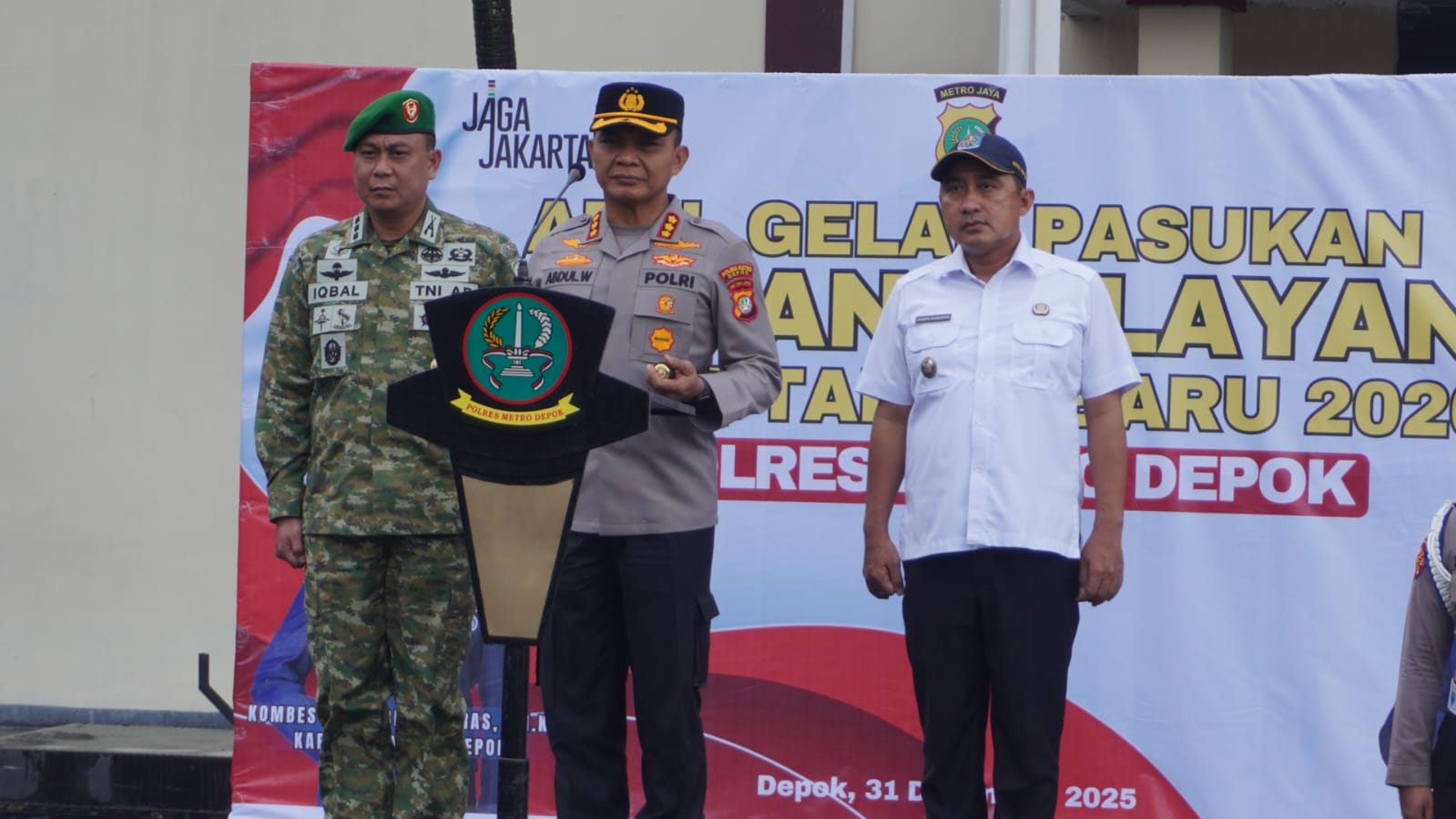 Jajaran TNI, Polri, dan Pemerintah Kota Depok menggelar Apel Pengamanan Perayaan Malam Tahun Baru 2026 di Lapangan Mapolrestro Depok, Jalan Margonda Raya No. 54, Kecamatan Pancoran Mas, Kota Depok, Rabu (31/12/2025) sore.