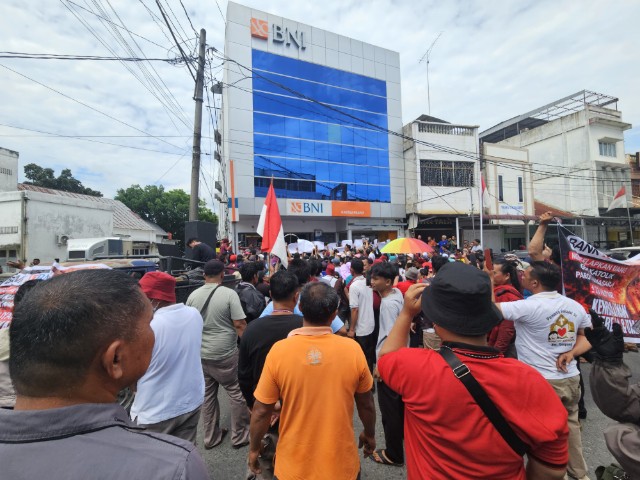 Ratusan umat Paroki Santo Fransiskus Asisi Aek Nabara kembali mendatangi kantor salah satu bank milik negara di Rantau Prapat, Rabu (15/4/2026). Mereka menuntut kejelasan terkait dana simpanan yang hingga kini belum diketahui keberadaannya.