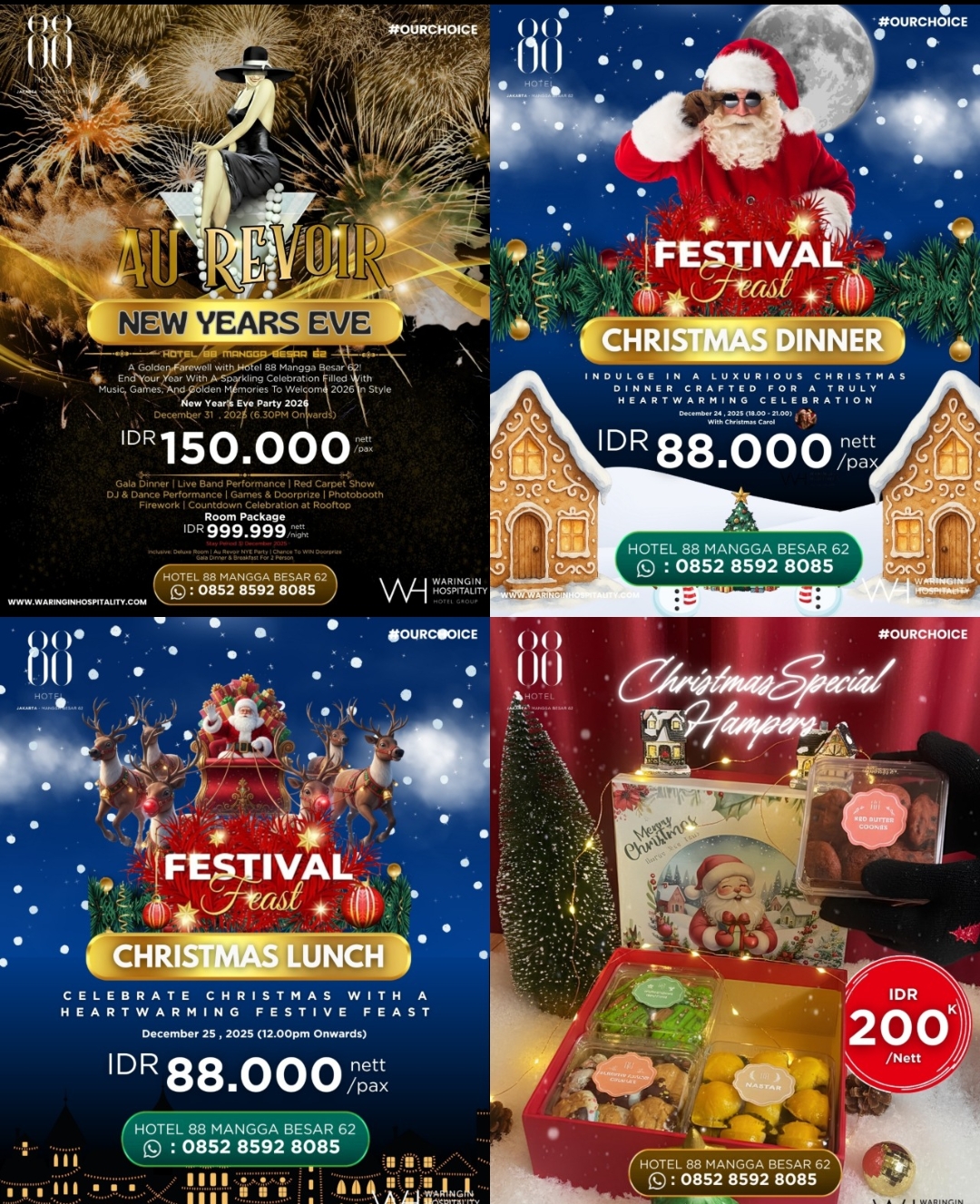 “Momen Natal dan Tahun Baru adalah waktu yang tepat untuk berbagi kebahagiaan. Melalui Christmas Feast, Christmas Hamper, dan AU REVOIR, kami ingin menghadirkan pengalaman yang hangat, berkualitas, dan berkesan bagi setiap tamu yang merayakan bersama Hotel 88 Mangga Besar 62,” ujar Aribowo.