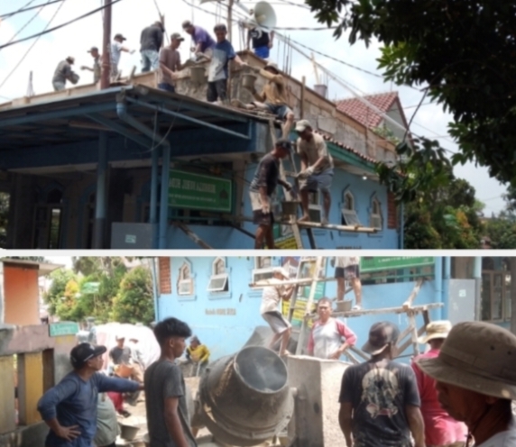 Warga beramai-ramai melakukan kerja bakti membangun dan merenovasi Mushola mereka sendiri dan sekaligus menambah bangunan lebih ditingkatkan akan menjadi duan lantai.