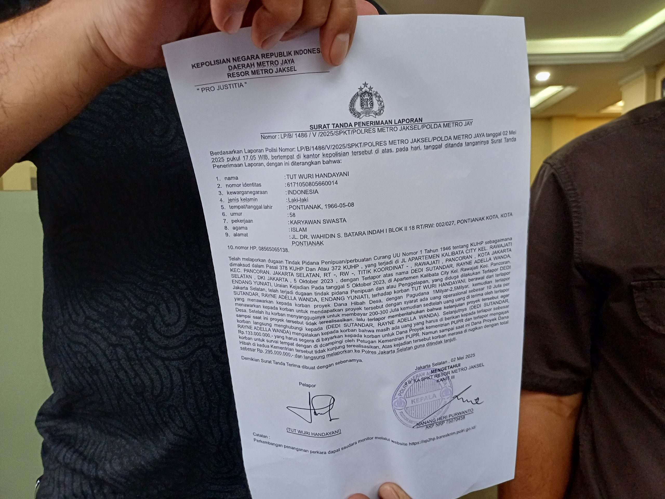Laporan polisi tercatat dengan nomor LP/B/1486/V/2025/SPKT/POLRES METRO JAKSEL/POLDA METRO JAYA. Dugaan penipuan dilakukan oleh individu bernama Endang Yuniati (warga Cibitung), Dedi Standar (warga Bandung), dan seorang perempuan bernama Ibu Reni (warga Bandung). Dedi mengaku sebagai pegawai Kementerian Keuangan, sedangkan Reni mengklaim memiliki jabatan di MPR RI. Keduanya diketahui merupakan pasangan suami istri.