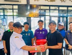 Ketua Askot PSSI Depok Meiyadi Rakasiwi, memberikan bingkisan semangat berjuang kepada tim porprov.