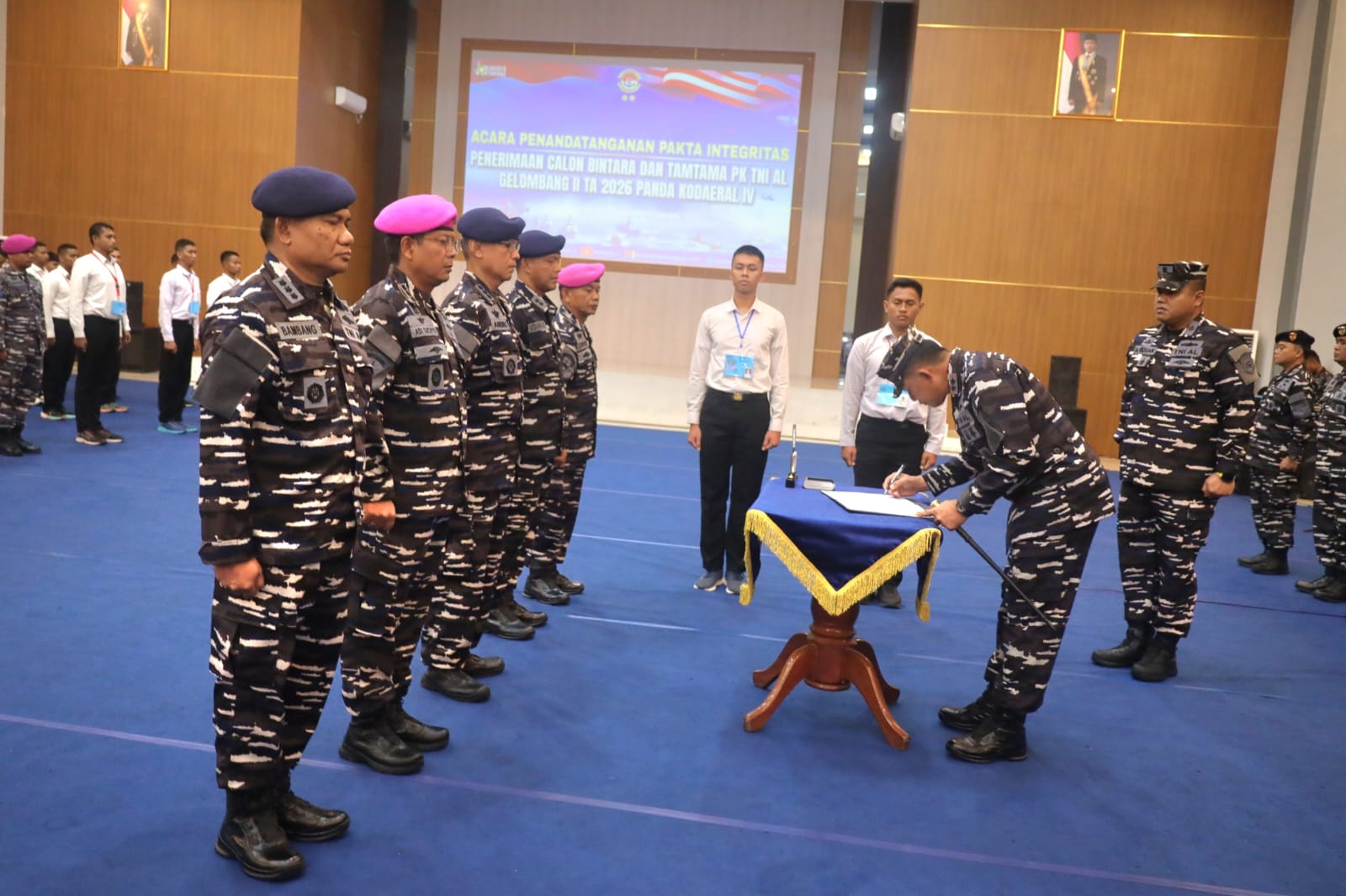 Komando Daerah Angkatan Laut (Kodaeral) IV menegaskan komitmennya dalam mewujudkan proses seleksi prajurit yang bersih, adil, dan transparan. Hal ini ditandai dengan penandatanganan Pakta Integritas oleh Calon Bintara (Caba) pria dan Calon Tamtama (Cata) PK TNI AL Gelombang II Tahun Anggaran 2026.