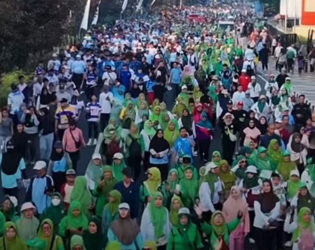 Momen car free day (CFD) semakin meriah dengan atraksi paramotor di atas langit Jalan Margonda Raya, Depok, Jawa Barat pada Minggu (26/4/2026).