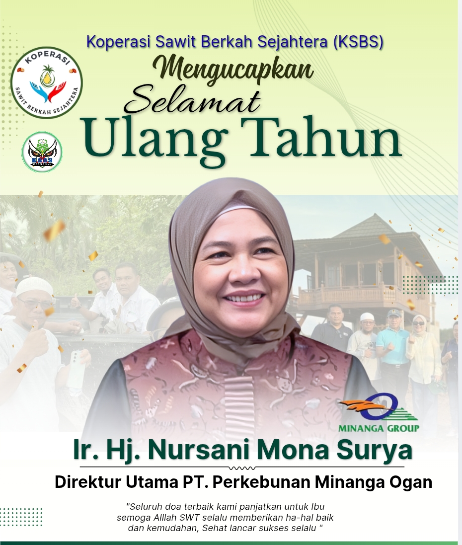 Koperasi Sawit Berkah Sejahtera (KSBS) menyampaikan ucapan selamat ulang tahun kepada Direktur Utama PT Perkebunan Minanga Ogan, Ir. Hj. Nursani Mona Surya. Ucapan tersebut disertai doa terbaik agar beliau senantiasa diberikan kesehatan, umur panjang, kemudahan dalam setiap langkah, serta kesuksesan yang berkelanjutan dalam memimpin perusahaan.