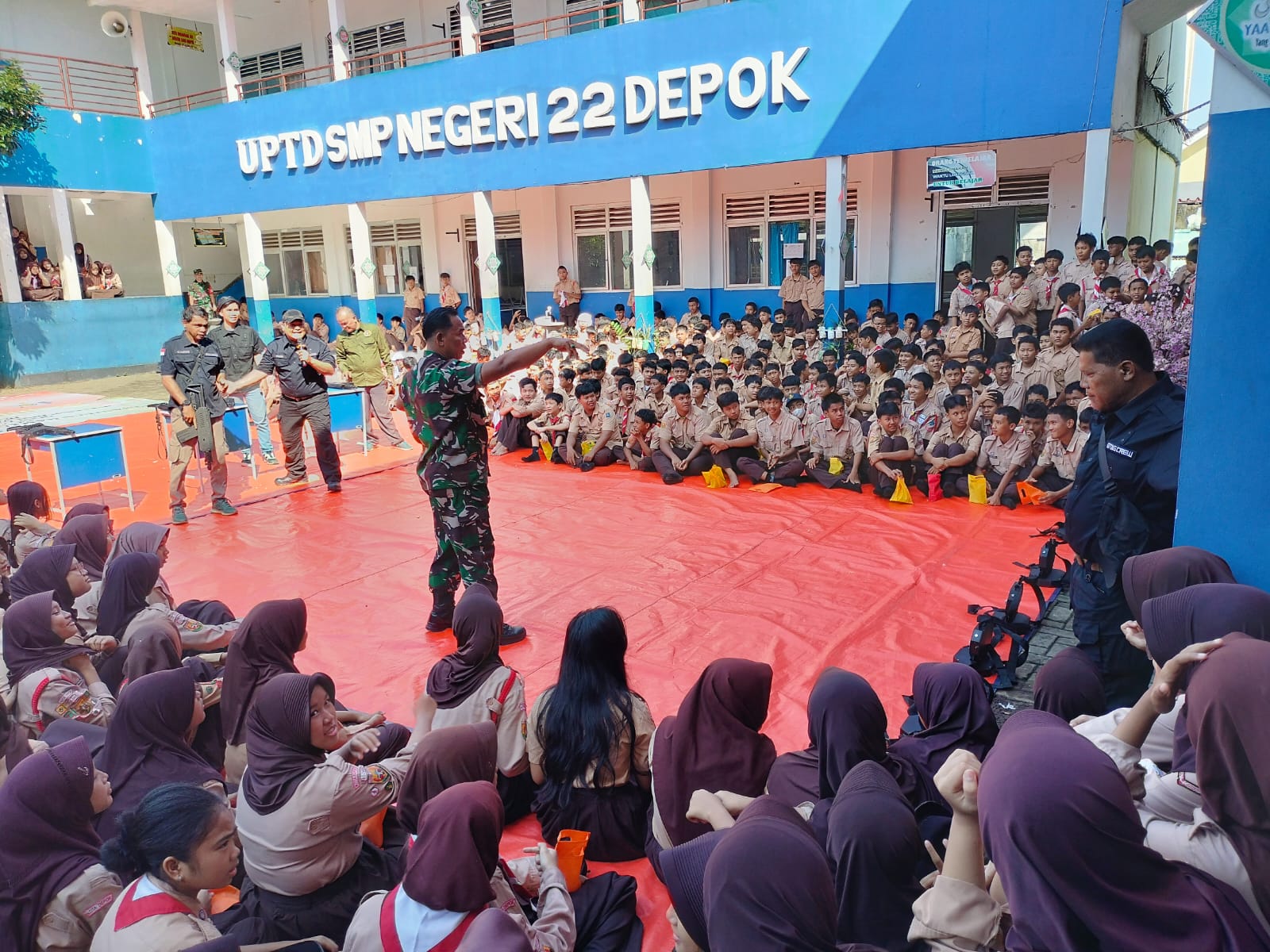 Koramil 03/Sukmajaya Kodim 0508/Depok dibawah pimpinan Mayor Inf Suyono (Danramil 03/Sukmajaya) melaksanakan kegiatan Wawasan Kebangsaan bekerjasama dengan PT. Garuda Modern Indonesia (GMI), Pimpinan Ibu Milla ke SMPN 22 Depok, Rabu (28/05/2022).