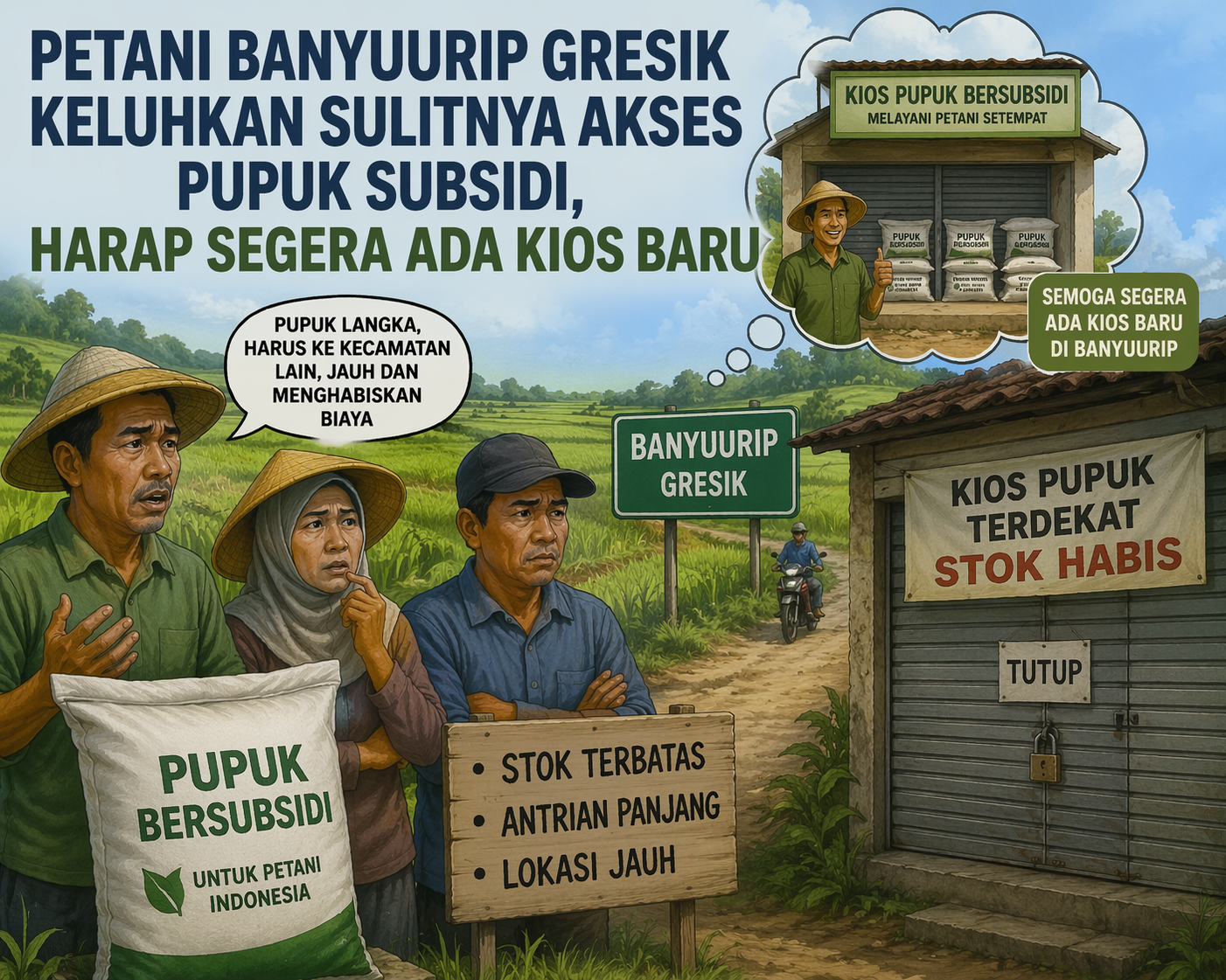 Para petani di Desa Banyuurip, Kecamatan Kedamean, Kabupaten Gresik, mengeluhkan sulitnya mendapatkan pupuk subsidi setelah kios resmi yang sebelumnya ditunjuk distributor ditutup. Kondisi ini membuat petani harus mencari pupuk hingga ke desa lain dengan biaya tambahan dan ketersediaan yang belum tentu terjamin.