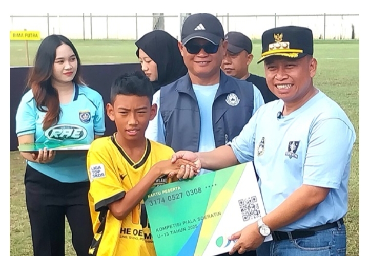 Walikota Depok, Dr. H. Supian Suri didampingi Ketua Askot PSSI Depok, Meiyadi Rakasiwi, usai membuka kompetisi Piala Soeratin U-13 di Stadion Merpati. Menyerahkan asuransi kesehatan kepada peserta Piala Soeratin U-13.