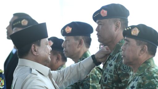 Presiden Prabowo Subianto melantik Wakil Panglima TNI dan tiga Kepala Badan di lingkungan Kementerian Pertahanan dalam Upacara Gelar Pasukan Operasional dan Kehormatan Militer di Komplek Pusat Pendidikan dan Pelatihan Komando Pasukan Khusus (Pusdiklat Kopassus), Batujajar, Kabupaten Bandung Barat, Minggu (10/8/2025). Pelantikan ini dilaksanakan bersamaan dengan penganugerahan pangkat Jenderal Kehormatan dan Tanda Kehormatan Bintang Sakti kepada sejumlah tokoh militer dan purnawirawan.