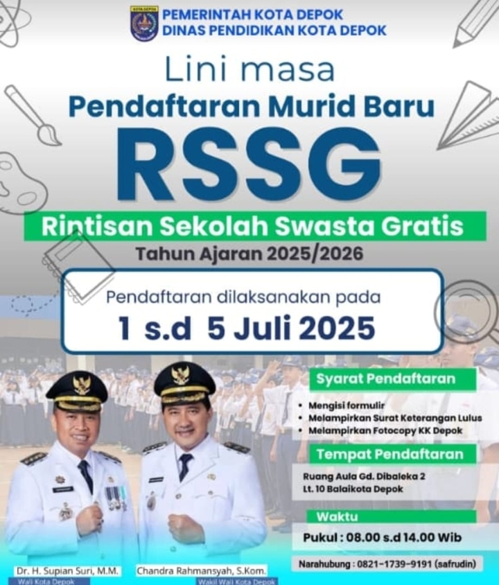 Dinas Pendidikan (Disdik) Kota Depok membuka pendaftaran peserta didik baru untuk program Rintisan Sekolah Swasta Gratis (RSSG) jenjang Sekolah Menengah Pertama (SMP) dan Madrasah Tsanawiyah (MTs).