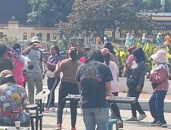 Tokoh Perempuan Depok yang juga mantan Anggota Legislatif, Hj. Enthy hadir di Acara ‘Care For Depok” ditengah Grup Musik Gong Merah Putih sedang pentas.