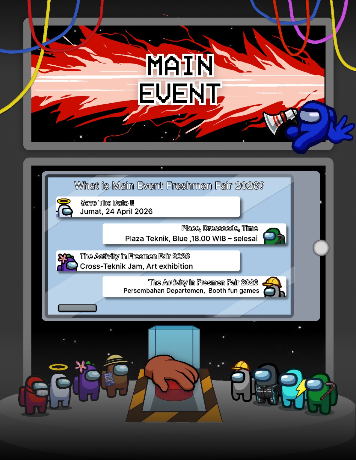 Acara akan berlangsung di Plaza Teknik dengan ketentuan dresscode berwarna biru. Panitia mengajak seluruh mahasiswa untuk hadir dan merasakan langsung pengalaman hiburan sekaligus kebersamaan dalam Main Event Freshmen Fair 2026.