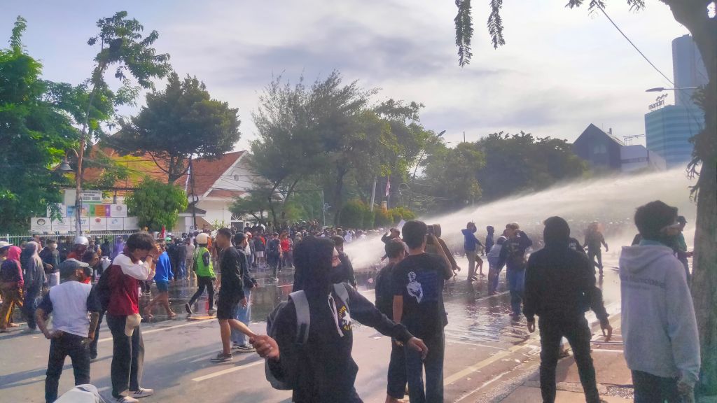 Polisi yang berjaga berupaya memukul mundur massa dengan water cannon dan gas air mata. Tapi massa tak kunjung surut. Batu terus dilemparkan, teriakan kemarahan bergema. Saat gas air mata ditembakkan lebih banyak, barulah massa kocar-kacir, menyebar ke jantung kota.