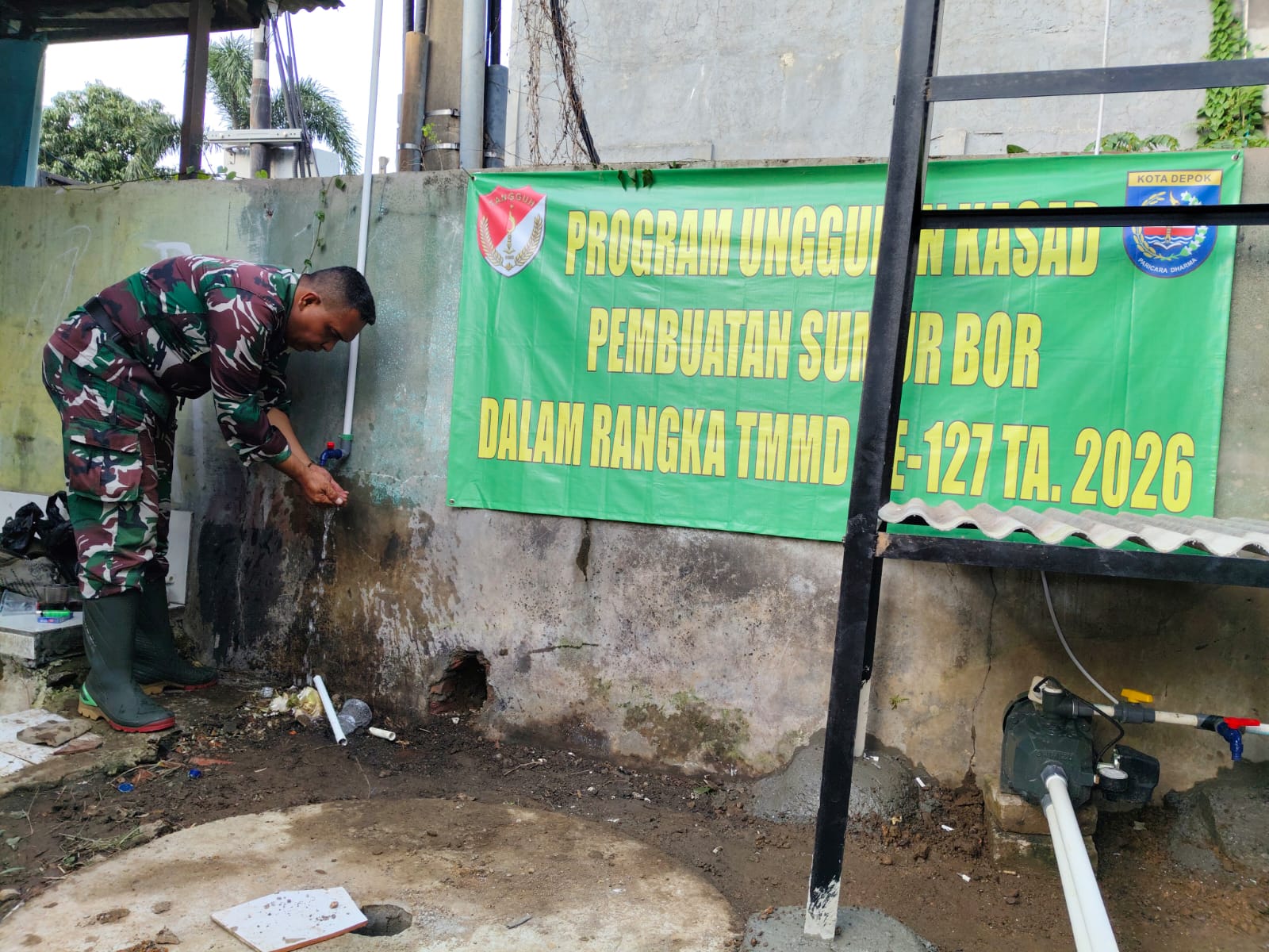 Program TNI Manunggal Membangun Desa (TMMD) Ke-127 Tahun Anggaran 2026 yang dilaksanakan Kodim 0508/Depok terus mempercepat pembangunan infrastruktur dasar bagi masyarakat. Memasuki hari ke-22, Rabu (4/3/2026), pembangunan sumur bor di sejumlah titik di Kota Depok menunjukkan hasil signifikan.
