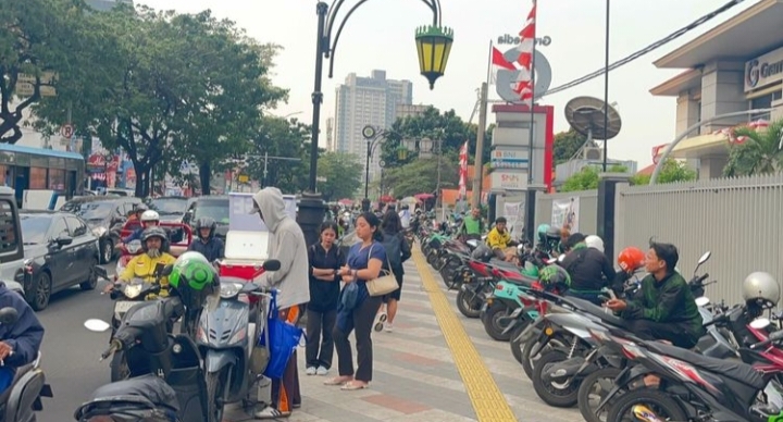 Beberapa pengendara motor yang parkir tampak mampir ke tempat makan atau yang hendak menuju pusat perbelanjaan. Terlihat juga para ojek online (ojol) tampak menunggu pesanan dari aplikasinya.