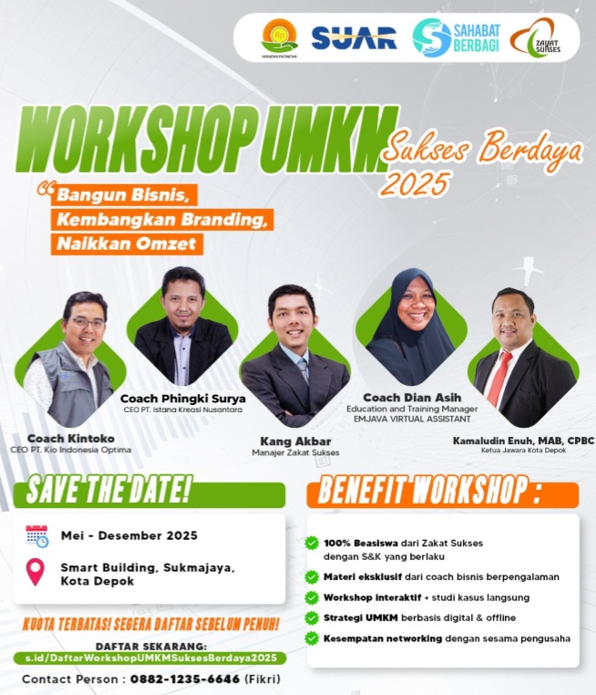 Dalam upaya memperkuat daya saing UMKM dan mendorong kemandirian ekonomi berbasis zakat, Zakat Sukses bekerja sama dengan LPK SUAR Indonesia dan Sahabat Berbagi mengadakan Program Intensif Workshop UMKM Sukses Berdaya 2025. Program ini merupakan bagian dari inisiatif Mandiri Ekonomi by Zakat Sukses, yang bertujuan memberdayakan UMKM mikro dan kecil agar lebih kompetitif, berkelanjutan, serta mampu bertumbuh di era digital.